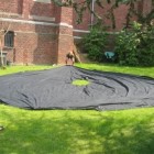 Unsere neue Großjurte, welche eigentlich nur aus einem neuen, dieses Mal schon fest zusammengenähten Dach besteht – die Seitenteile sind jurtentypisch modular anfügbar, bauten wir testweise teilweise auf der Pfarrwiese auf.